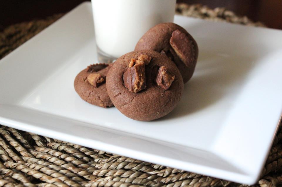 As a THANK YOU to my husband, twin sister and closest girlfriend for painting Arianna’s nursery room yesterday, I found myself in the kitchen at 2am whipping up a new chocolate cookie recipe (oh the joys of pregnancy insomnia). With Reeses Peanut Butter Cups. And so you ask, “ANOTHER recipe involving chocolate and peanut butter??” But of course! Who would I be without some chocolate involved? *wink* And no, I’m not hesitant at all about expressing my adamant LOVE for this plump, decadent morsel! This is by far one of the best chocolate cookies I’ve ever tasted! Now I’m sitting here staring at a tupperware container half filled with these peanut buttery swirled beauties while unsuccessfully attempting to restrain my hungry, pregnant self from consuming them all in one mere sitting. This is not an easy thing to do, my friends. Not at all. So in an attempt to feel less guilty about my obsessive tendencies towards gleeful, unbridled consumption, now it’s your turn…
